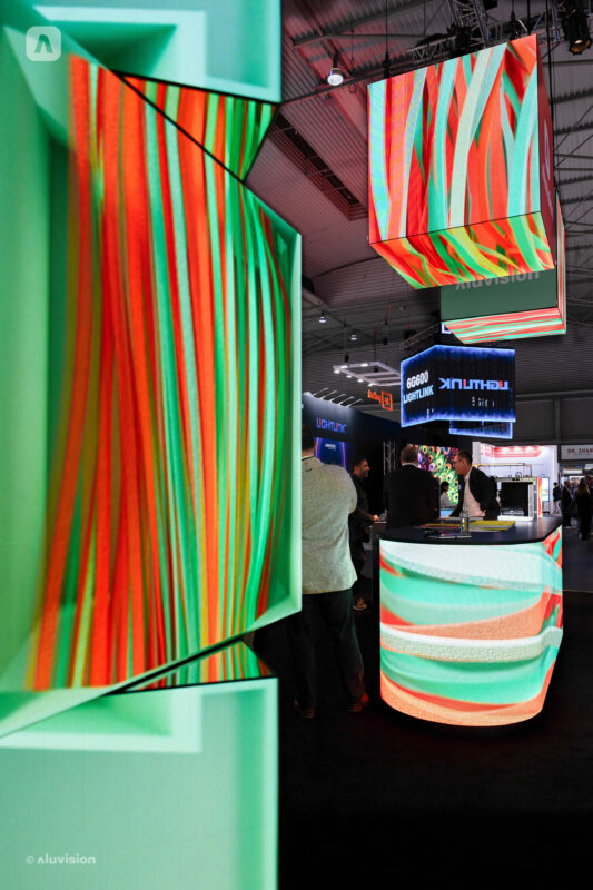 Create flowing, organic shapes with curved LED strips that wrap around structures. This style adds depth and movement to your booth.